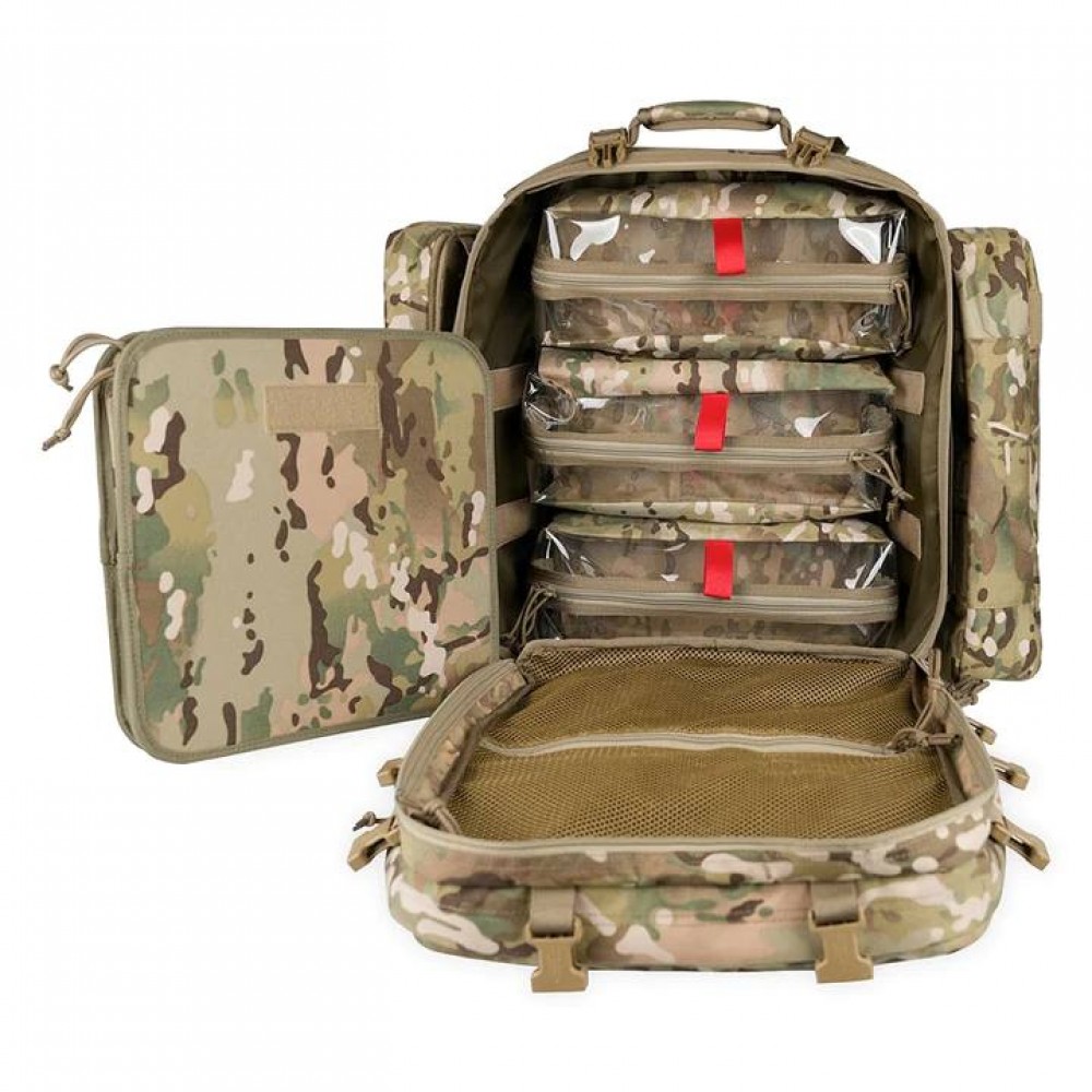 Тактический медицинский рюкзак Rhino Rescue R40 представлен в камуфляжном стиле "мультикам" и имеет объем 40 литров. Рюкзак разработан для профессионального использования и характеризуется сложной структурой с множеством карманов и отсеков для хранения медицинских принадлежностей и инструментов.
